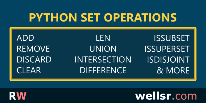This tutorial shows you how to perform Python set operations, like adding and removing items, and finding the union, intersection, and difference between sets.