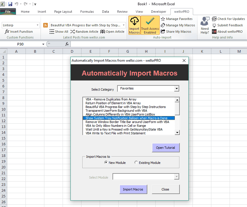 wellsrPRO is an innovative new VBA Training Program that transforms Excel into your own personal macro library - allowing you to seamlessly import hundreds of macros directly from the expert VBA tutorials at wellsr.com and from other great developers throughout the wellsrPRO community.