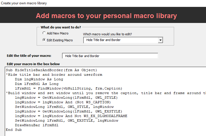 I love hearing stories from programmers describing how much time their macro library saves them! It dramatically reduces the amount of time it takes to create robust VBA applications from scratch.