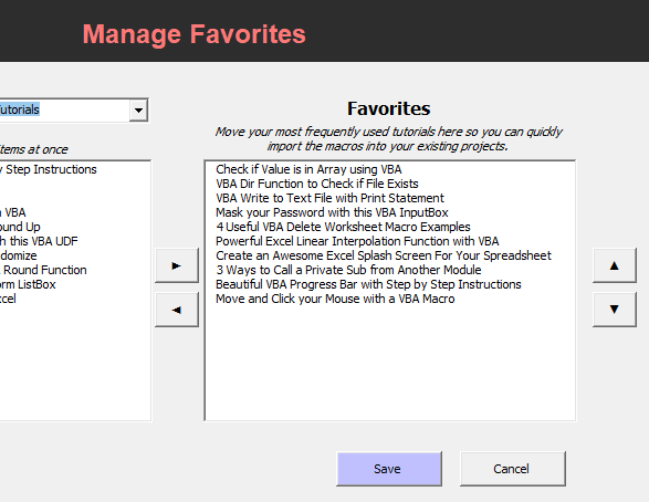 Instant access to the latest tutorials from the VBA Tutorials Blog means you'll be able to expand your VBA knowledge without leaving Excel. The most recent tutorials automatically appear in a dropdown menu right in your Excel ribbon.