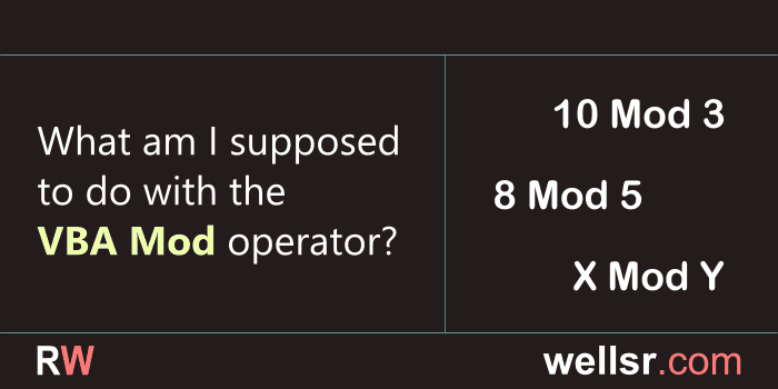 The VBA Mod operator is the VBA equivalent of the Excel MOD function. You use the VBA modulo operator to return the remainder after dividing two numbers.