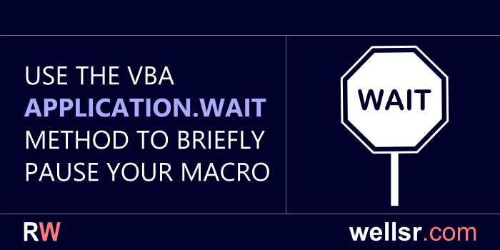 Use the VBA Application.Wait method to pause your macro for a specific amount of time. Application.Wait lets you delay your macro by a fixed number of seconds.