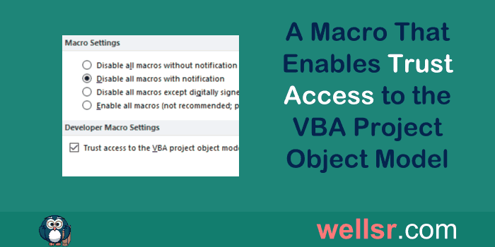 You can programmatically enable trust access to the VBA project object model with this macro. Doing so allows you to add modules and write macros from a macro.