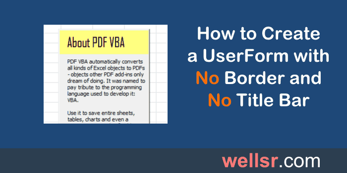 This tutorial shows you how to hide the border on your UserForm using VBA. A UserForm without a title bar and X button are far cleaner than normal UserForms.