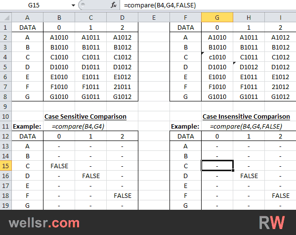 This Excel VBA Function will compare two cells and return whether or not the cells are identical. Use it to compare data from two different sources.