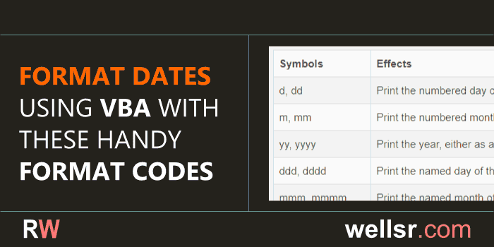 Learn how to format dates in VBA using both the Format function and the NumberFormat property. Much of the focus of this date formatting VBA tutorial is on writing custom format codes for your macros.
