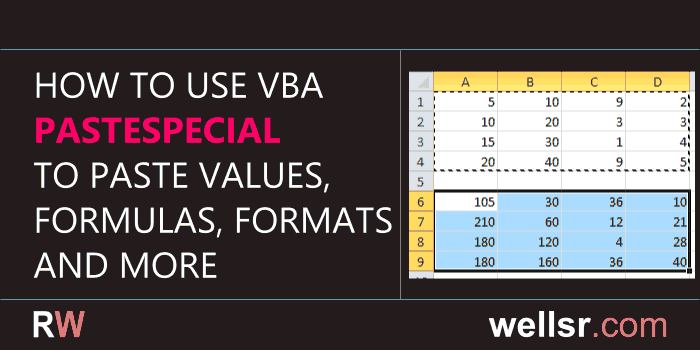 Use the VBA PasteSpecial Method to paste values, formats, formulas and more. You can even use VBA PasteSpecial to perform math on entire ranges and transpose data.