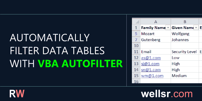 Use VBA AutoFilter to filter data in Excel. The VBA AutoFilter method lets you filter multiple fields at once and even filter on more than one criteria.