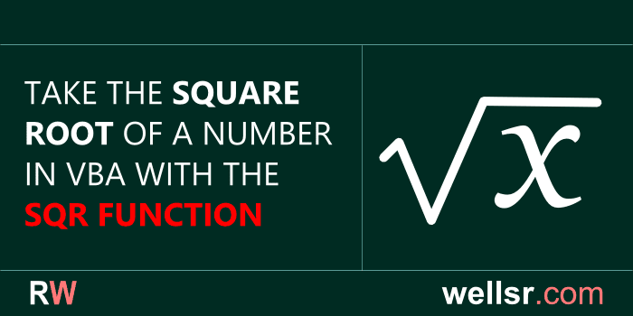 This VBA tutorial shows you how to take the square root of a number in VBA using the Sqr function. The VBA Sqr function will return the square root of a number.